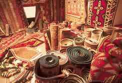 throughout the field of the rug. Aniline Dye: A synthetic dye made from coal tar. In the early 1900's it was banned in Persia because the dyes were not colorfast. Antique Finish: A modern chemical washing procedure that produces softer tones or antiques the rug. Art Silk: Artificial silk, normally made with mercerized cotton. It looses its sheen when used and doesn't wear well. Aubusson: French design flat weave rug normally with a floral center medallion and pastel colors. Border: A design that surrounds the field in a rug and forms a visual frame for main design. Boteh: A teardrop shaped motif used in rug designs, characteristic of the paisley pattern. The boteh may represent a leaf, pear or pine cone. Cartoon: Map of design and colors drawn on paper used as a guide to weave a rug. Cartouche: A cloudlike design that surrounds a woven signature, date or inscription in a rug. Carved Nap/Pile: A process of carving around a design or symbol to enhance the look of the rug. This is commonly done in some Chinese and Tibet rugs. Caucasian: Rugs were mainly woven in Azerbaijan, which is part of the Caucasus Mountain region. Chain stitch: A crochet stitch used in rug construction that consists of successive loops to lock the final weft in place at the end of a rug. Chemical Dyes: Modern synthetic dyes used in rugs woven after 1935. Chrome Dyes: Very colorfast synthetic dyes developed in the early 1900's. Cloth Backed Rug: Normally found on the back of an Indian or Chinese tufted rug. The material is called monk's cloth and hides the unsightly glued tufts. Cochineal: Deep red dye obtained from the dried bodies of a type of insect (Dactylopius coccus cacti). Colorfast: If a rug has colorfast dyes, the colors are stable and will not run when washed. Color Run: The term used to describe the migration of one color into another. Red and blue are the usual culprits. Combing: Process of preparing wool fibers for spinning by sorting them in the same direction. Dhurrie: A flat-woven rug from India usually made of cotton or wool. Dry rot: Deterioration of the rug pile and foundation over the years when it becomes dry and brittle. Also caused by liquids or moisture remaining on a rug for an extended time causing the rug to rot. Embossing: A process of carving around a design or symbol to enhance the look of the rug. Commonly done in some Chinese and Tibet rugs. Endless knot: A Buddhist emblem symbolizing long duration, often used with other symbols. Field: The part of a rug’s design surrounded by the border or borders. The field may be blank or contain medallions or an overall pattern. Flat-Weave: Describes a rug that has a flat pile, which includes Dhurrie, Jajim, Kilim and Soumak. Foundation: The backing of the rug composed of the warp and weft strings. It is made of cotton, wool or silk. Fringe: The ends of the rug. Warps extending from each end of a rug which are treated in several ways to prevent the wefts and knots from unraveling. Fugitive Dye: A dye that migrates into another color or fades. Garden Design: Panel designs throughout the field woven with floral motifs, particularly found in a Persian Bahktiari. Ghiordes Knot: A symmetrical knot or Turkish knot. Gul: A medallion either octagonal or angular in shape, used in Turkmen design rugs. It is often repeated to form an allover pattern in the field. An example of this is the small repeating elephant foot design found in Bohkara rugs. Hali: The Turkish word for carpet. Hatchli: A design found in Turkmen rugs in which the field is divided into sections by stripes or bars. Herati: A rosette surrounded by a fish pattern repeating throughout the field of a rug. Indigo: Blue dyes obtained from the leaves of the indigo plant. Jajim: A warp faced fabric woven in long narrow strips. They are later cut into equal lengths and sewn together. Jufti Knot: A knot tied over four wraps instead of usual two. It is called a false knot. The technique simplifies the knot for the weaver. Kilim: A tapestry-like woven rug. It is a flat rug with no pile. Knot: A knot is formed when wool, cotton or silk yarn is looped around the warp threads. There are different procedures for knotting and each knot type has a name, for example there is a Turkish/Ghiordes knot, Persian/Sennah knot, and the Jufti. Knots per square inch: Number of knots per square inch rates the knot quality. Usually noted by the K.P.S.I. designation (ex. K.P.S.I. 240). Kork Wool: The very finest quality wool obtained from the shoulder and flanks of shearling lambs. Loom: A wooden structure that holds the warp and weft threads for weaving the rug. It can be vertical and horizontal. The height and width of the loom determines the rug size. Madder: A powder extracted from the root of a Rubia plant used to make red dye. Medallion: The large enclosed portion of a design, usually in the center of the rug field. Typical shapes are diamonds, octagons and hexagons. Mihrab: The arch of a mosque in a prayer rug indicating the direction of Mecca. Mordant: An additive that makes dyes more stable and allows the dyes to penetrate the wool. Mori: The weaving technique of certain Pakistani and Indian rugs. Nap: Top or body of the rug where the knot ends are cut, normally made of wool or silk. Overcast sides: Technique of over-rounding wool on the non-fringe sides of a rug. Oxidation: The chemical reaction that occurs when excess sunlight exposure and age can change rug colors. The colors usually affected are brown or black. Generally occurs in vegetable dyed rugs. Palmette: Lotus flower found in curvilinear and geometric rugs thought to represent the opium poppy. Painted Rugs: A process of actually painting the rug to improve its look. This does not add to the value of the rug. Patina: The mellowing of the surface appearance of a rug usually with age or use. Persian Knot: An asymmetrical knot that is looped around one thread with only a loose half-turn around the other thread. Pile: The nap of the rug or the tufts remaini